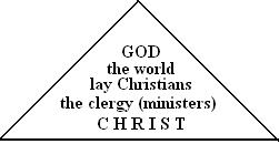 He suggested that the expression "promotion of the laity" can cause radical misunderstanding by suggesting that the laity are in an inferior position to the clergy and that their coming of age means new and equal or almost equal rights with the clergy. In such a view authority in the Church is easily seen as domination and power, and not as service. And so one can form a picture of the Church, with its mission and structures, where ecclesial life and reform are presented in terms of a contest or struggle for "power". Many people's view of the Church correspond in fact to what might be described as a "power pyramid". Thus: