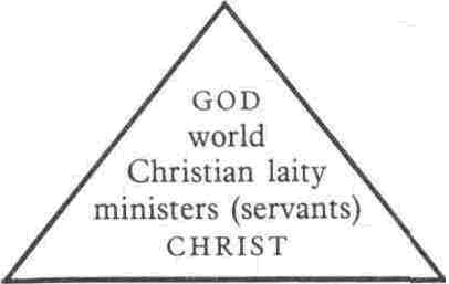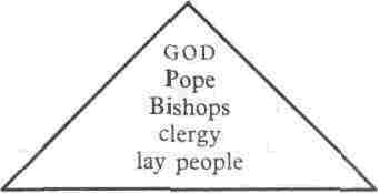 Personally, I prefer to avoid the expression "promotion of the laity," and to speak of "development of the proper role of lay people." "Promotion of the laity" can cause radical misunderstanding precisely by suggesting that the laity are in an inferior position to the clergy and that their coming of age means new and equal or almost equal rights with the clergy. In such a view authority in the Church is easily understood as domination and power, and not as service. And so one can form a picture of the Church, with its mission and structures, where ecclesial life and reform are presented in terms of a contest or struggle for "power." Many people's view of the Church corresponds in fact to what might be described as a power pyramid." Thus: